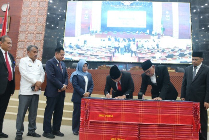 Pengesahan itu ditandatangani Penjabat (Pj) Gubenur Hassanudin bersama Wakil Ketua DPRD Sumut Harun Mustafa Nasution yang menandatangani keputusan bersama.