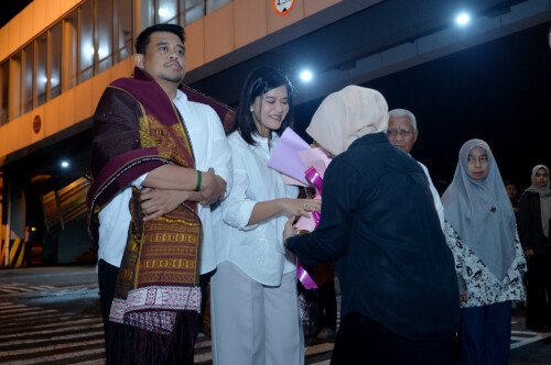 DELISERDANG.Ersyah.com l Gubernur Sumatera Utara (Sumut) M Bobby Afif Nasution disambut Kapolda Sumut Irjen Pol Whisnu Hermawan Februanto, Pangdam I/BB Rio Firdianto serta unsur Forum Koordinasi Pimpinan Daerah (Forkopimda) lainnya setibanya di Bandara Kualanamu, Deliserdang. Berdasarkan informasi diterima Ersyah.com, Sabtu (1/3/2025), Gubernur Bobby Nasution tiba bersama Wakil Gubernur Surya, Ketua TPP PKK Sumut Kahiyang Ayu, dan ketiga anaknya, Jum’at (28/2/2025).