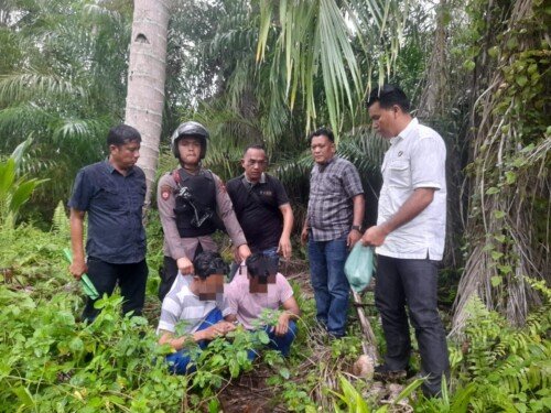 Petugas Satnarkoba Polres Batubara diabadikan dalam kebun sawit warga, usai menangkap dua pelaku bersama barang bukti sabu.(Foto. Humas Pol BB)