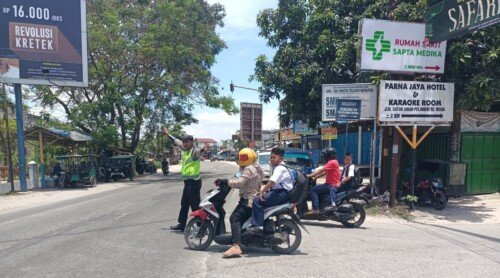 Petugas melakukan pengaturan arus lalu lintas, penindakan pelanggaran kasat mata, serta memberikan imbauan tegas kepada pengendara sepeda motor agar mematuhi aturan lalu lintas dan menggunakan helm berstandar SNI.