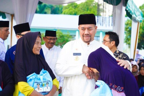 Bupati Batubara, H Baharuddin Siagian bersalaman dengan penerimaan bantuan sembako pada acara pesantren kilat.(Foto. Diskominfo BB)