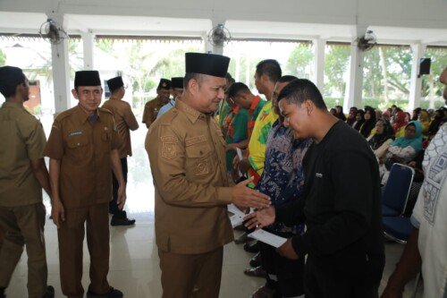 Wakil Bupati Asahan, Rianto saat menyerahkan Zakat dari Baznas kepada petugas kebersihan secara simbolis.(Ersyah/PMN10)