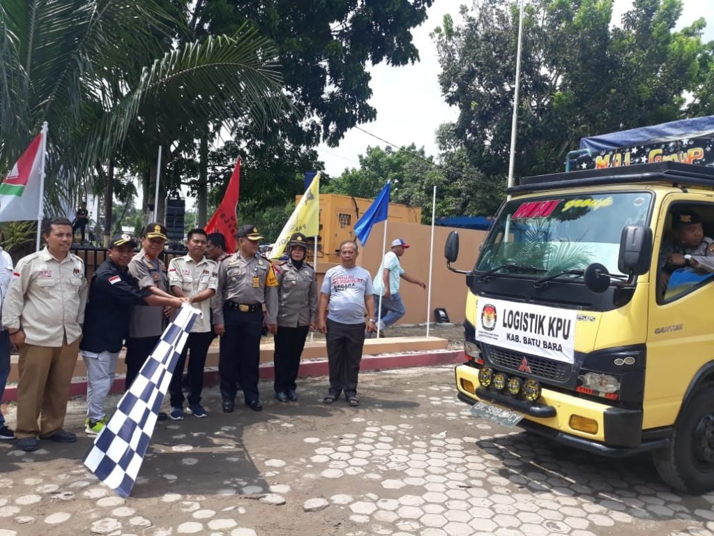 Batubara.Ersyah.com l Pendistribusian logistik Pemilu 2019 KPU Batubara ke 4 kecamatan menggunakan 11 truk, Sabtu (13/4). Pelepasan 11 truk bermuatan logistik…