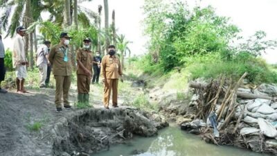 BATU BARA.Ersyah.com l Bupati Batubara Ir Zahir, MAP didampingi Kadis PUPR Khairul Anwar meninjau tanggul sungai Merbau Jebol akibat air di…