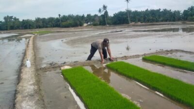 BATUBARA.Ersyah.com l Personil Bhabinkamtibmas Polsek Medang Deras Aipda Walter Hutahean turut penanaman padi di Desa Pakam Raya Selatan, Kecamatan Medang…